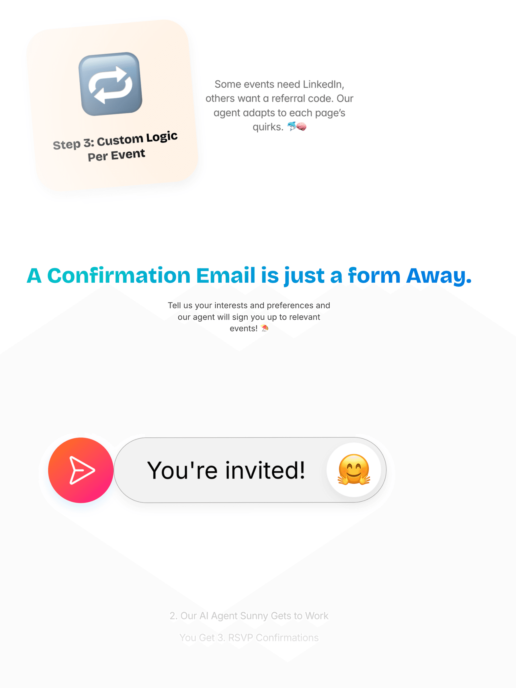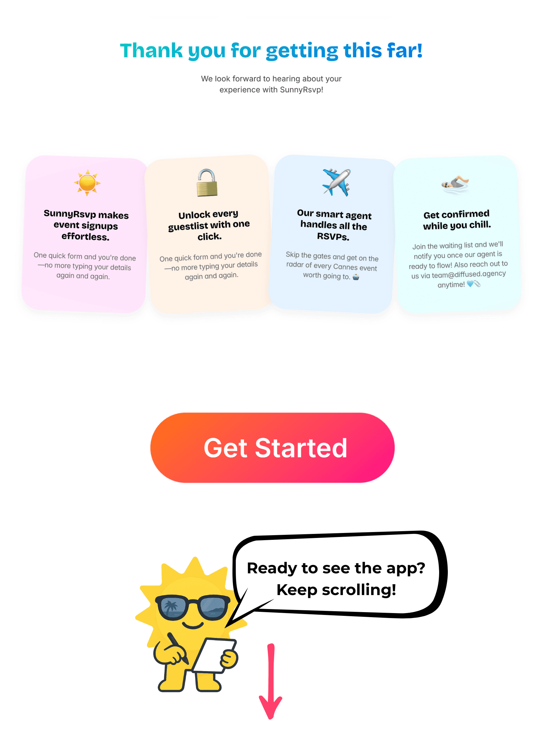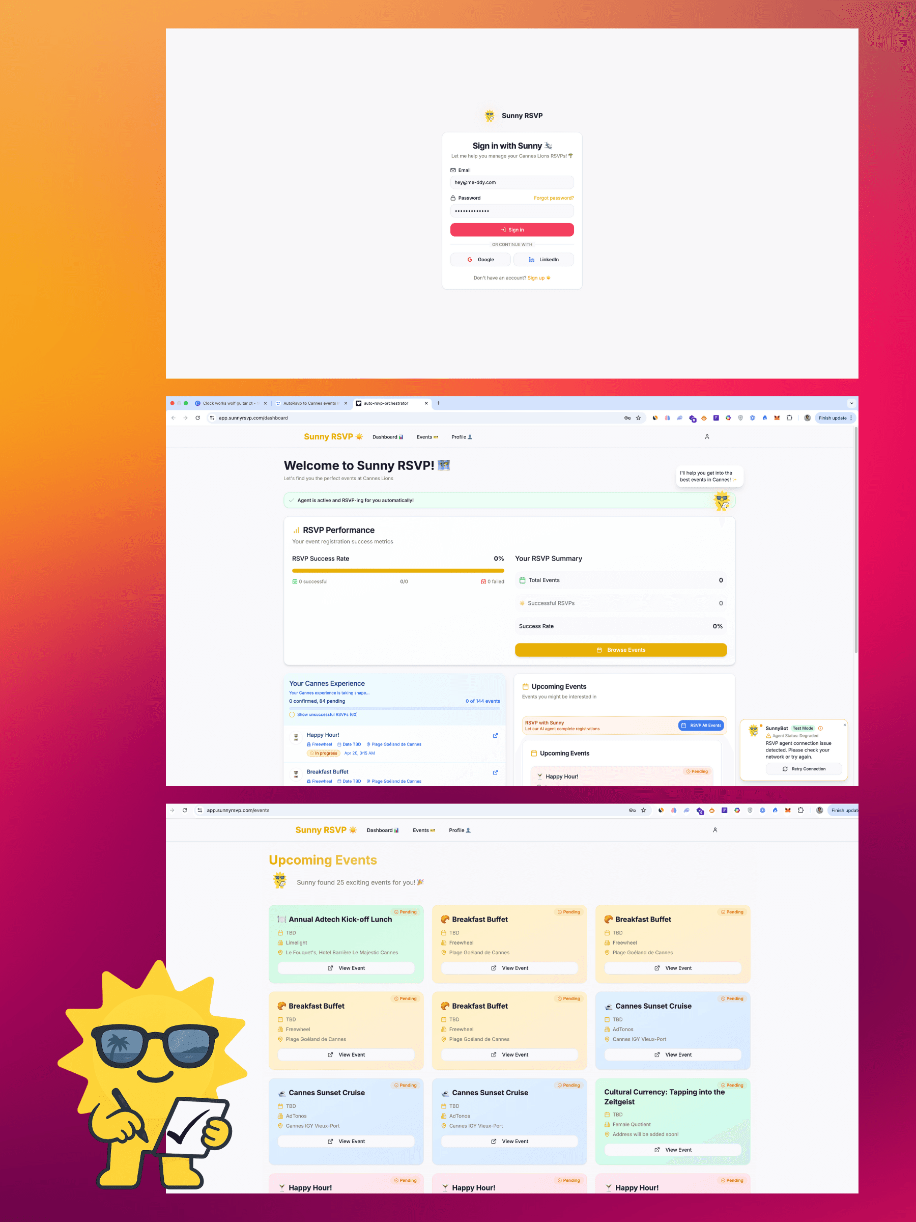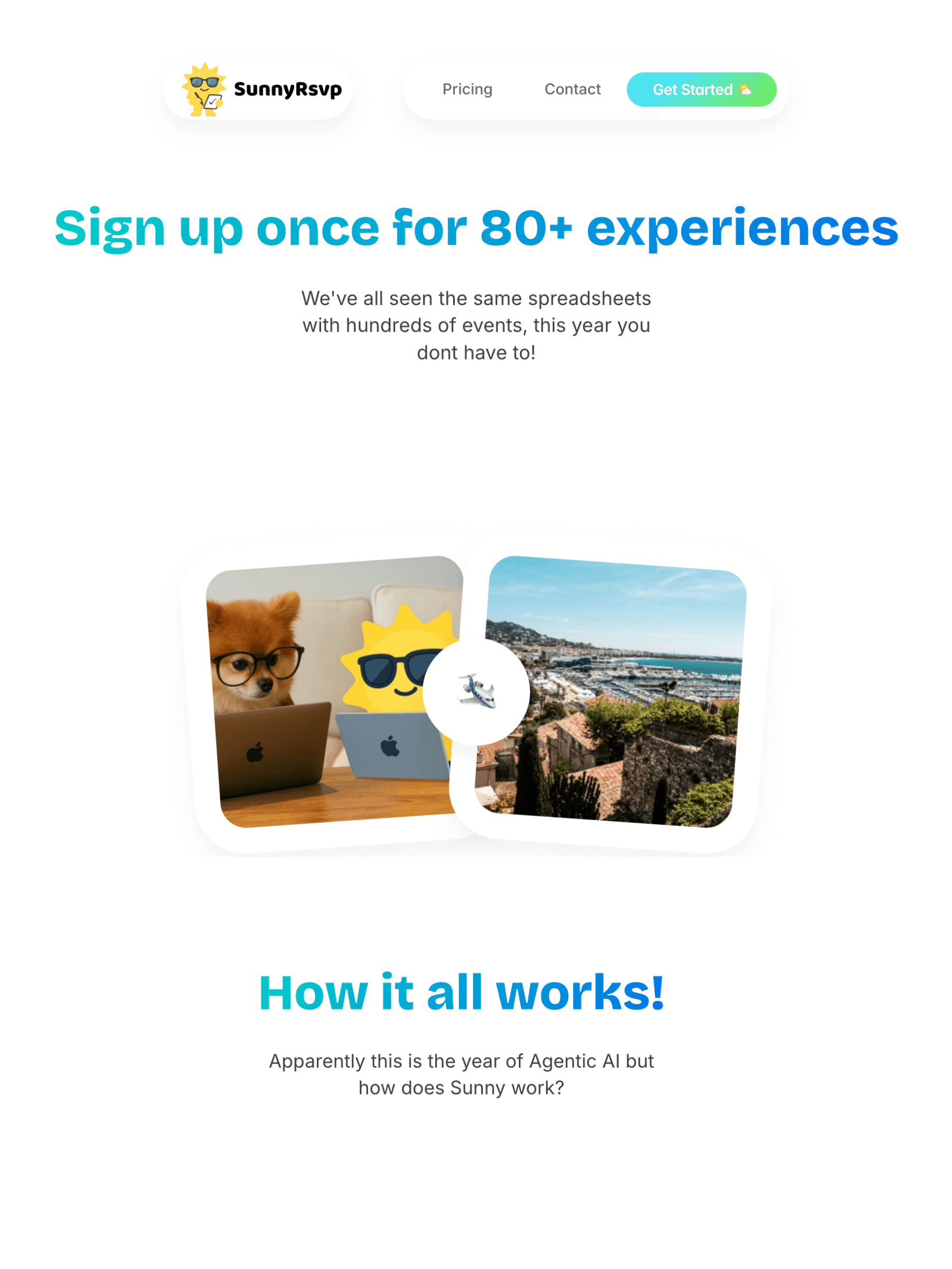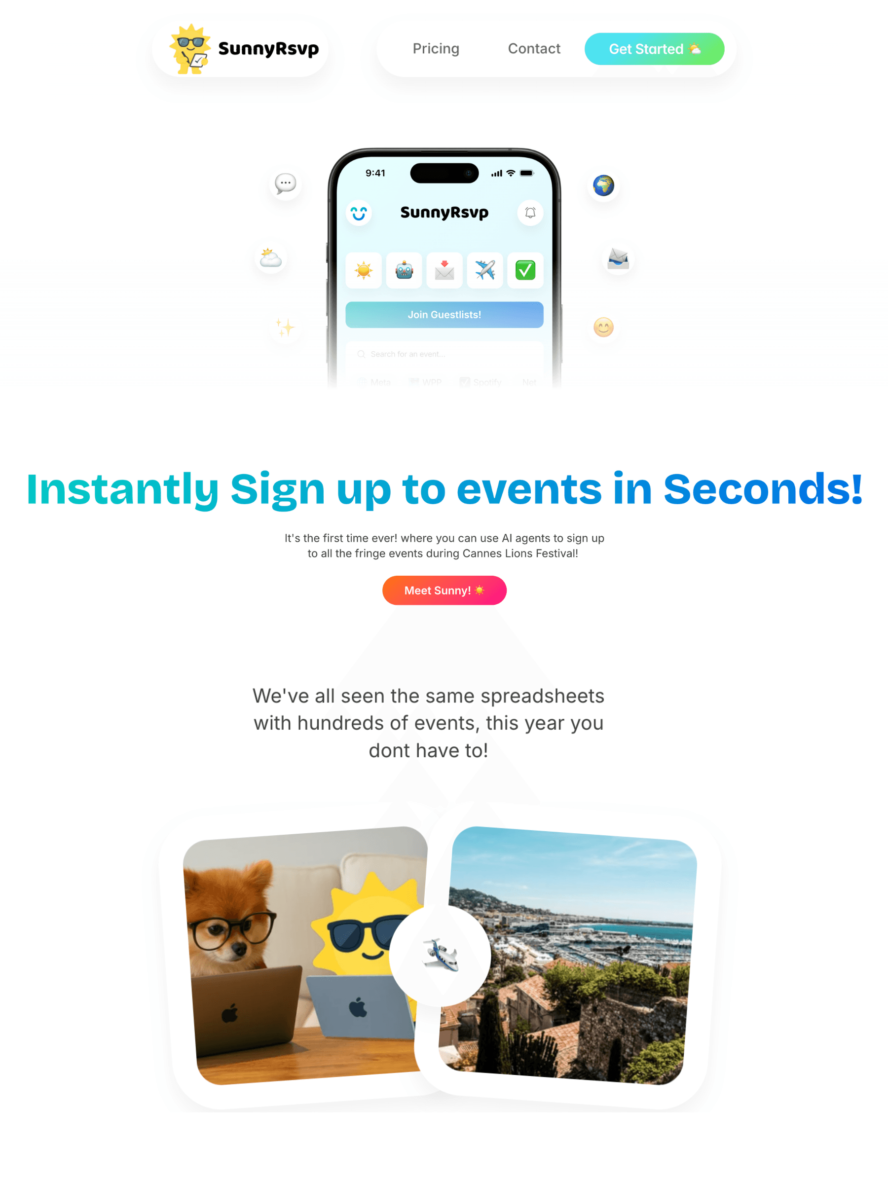 It's the first time ever! where you can use AI agents to sign up to all the fringe events during Cannes Lions Festival so instead of waiting on the usual spreadsheet I designed and developed a fun and effecient way to hear about the side events and integrated an MCP + Autonomous browser agent to work as your personal assist signing you up to all events of interest. Meet Sunny @ sunnyrsvp.com